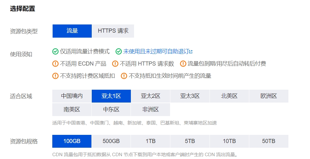 在配置CDN加速服务前需要购买流量,否则配置完成后网页无法访问。对于腾讯云,可以在CDN产品页面进行购买,资源包类型应选择流量,适合区域选择亚太1区,资源包规格选择100GB