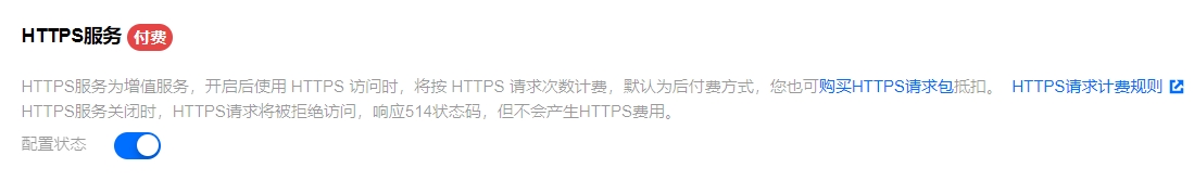 需要在域名管理中检查HTTPS配置中的HTTPS服务是否打开,处于关闭状态时网页可能无法正常访问。该服务每月提供300万次免费的访问,足够我们的个人网站使用。